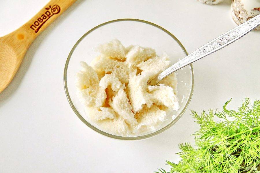 Срежьте у хлеба корочки, мякиш поломайте руками, сложите в миску и влейте немного воды. Перемешайте и оставьте хлеб на 10-15 минут.