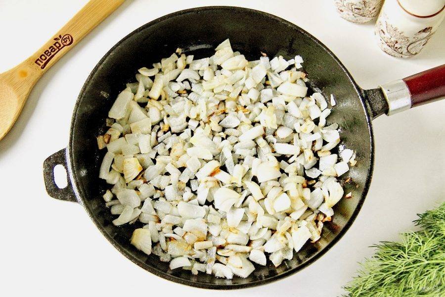 Лук нарежьте небольшими кубиками и обжарьте до мягкости.