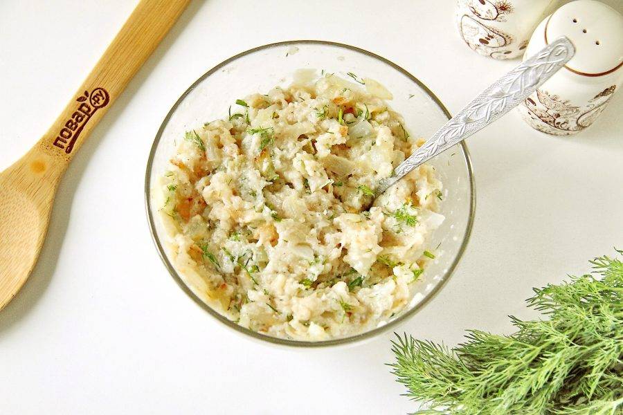 Добавьте отжатый от воды хлеб, обжаренный лук, измельченную свежую зелень, соль и свежемолотый перец.