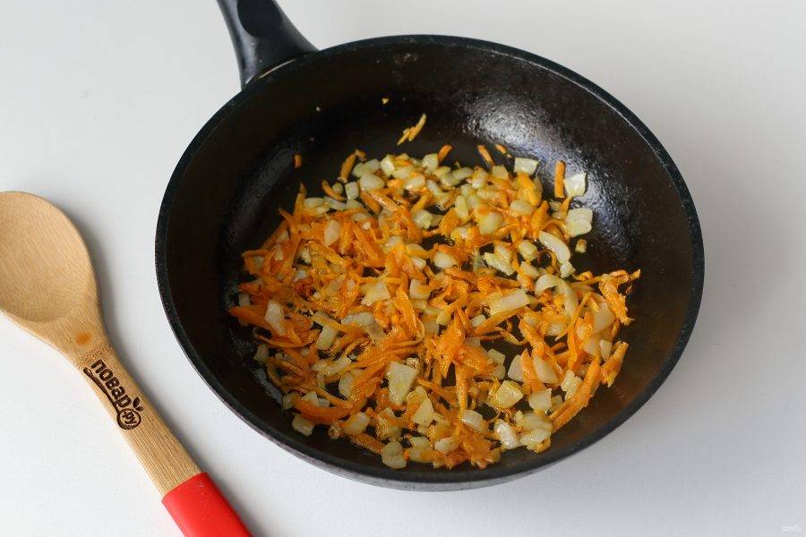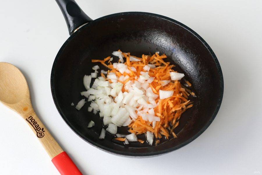 В сковороде нагрейте масло. Выложите нарезанный кубиками лук и тертую морковь.