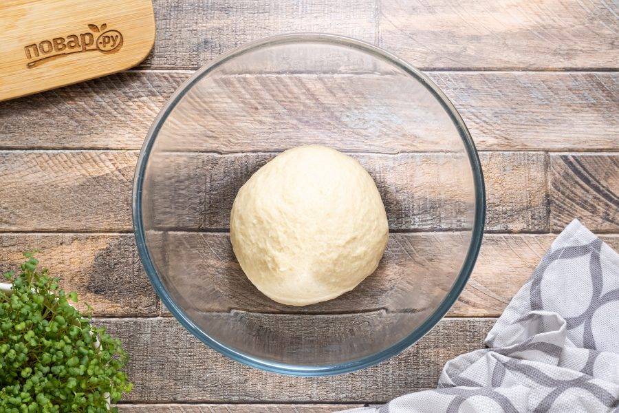 Вымешивайте тесто около 5 минут на столе, затем скатайте в шар. Переложите в миску смазанную растительным маслом. Накройте пленкой и уберите в теплое место на 1 час.