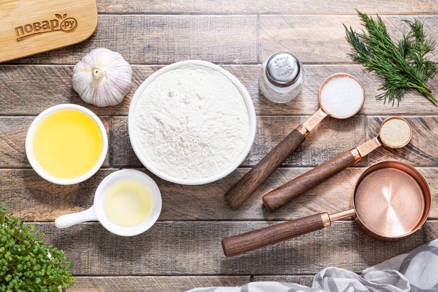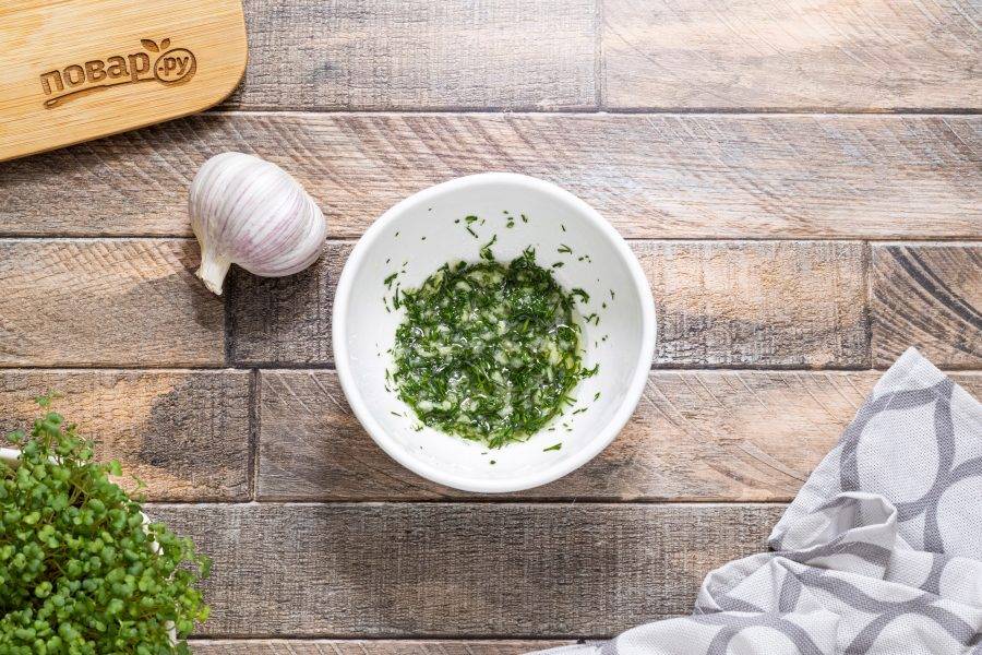 Пока выпекаются пампушки, заранее подготовьте чесночный соус. Мелко порубите укроп, чеснок пропустите через пресс. Смешайте чеснок и укроп вместе с водой и растительным маслом, добавьте соль по вкусу.