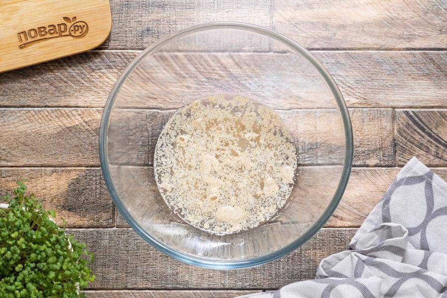 В глубокую миску влейте теплую воду, добавьте сахар и дрожжи. Хорошо размешайте, чтобы дрожжи и сахар полностью растворились.