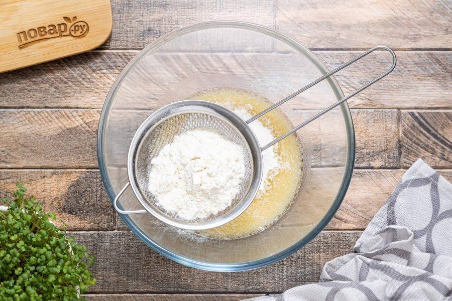 Постепенно начните всыпать просеянную муку и замешивать тесто. Тесто должно получиться мягким, податливым, может чуть липнуть к рукам. Можно чуть подсыпать муки по необходимости, но не сильно забивайте его мукой.
