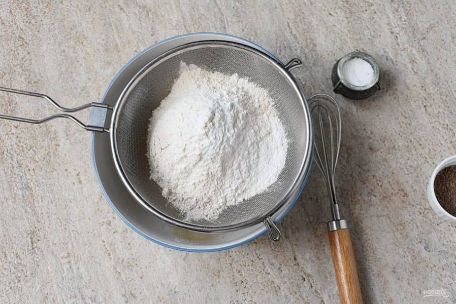 Просейте в миску оба вида муки и разрыхлитель.