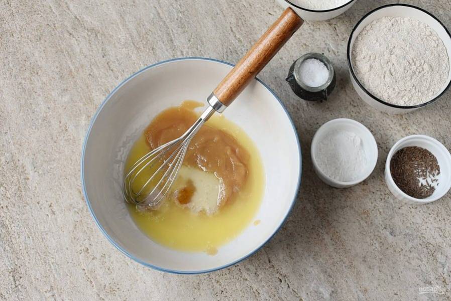 Смешайте в миске яблочное пюре, мед и растопленный и охлажденный постный маргарин и соль.