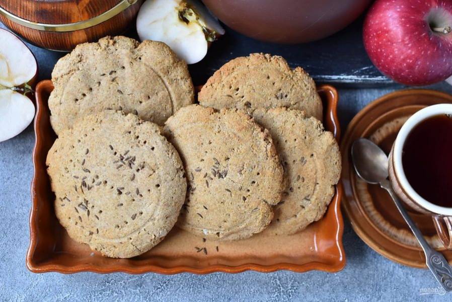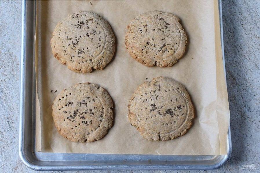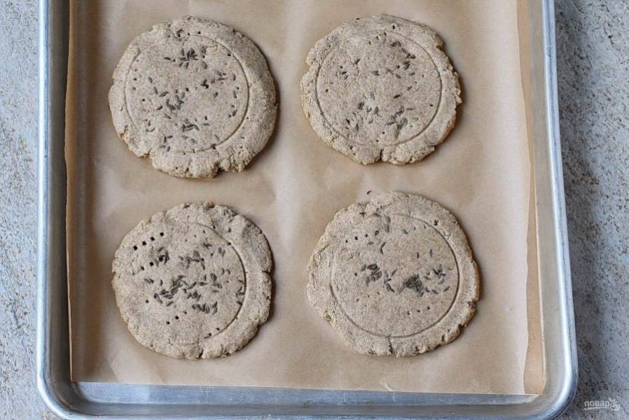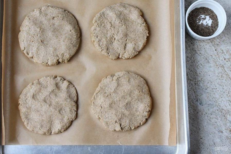 Посыпьте лепешки семенами тмина. Придавите сверху донышком стакана, чтобы семена не осыпались.