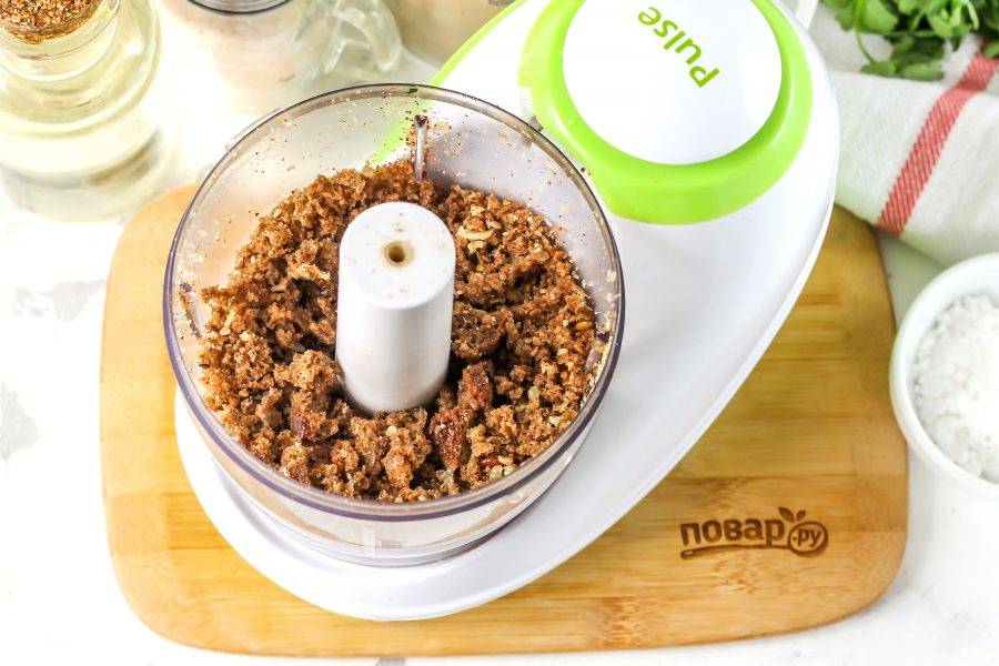Пробейте примерно 4-5 минут на пульсирующем режиме практически в крошку. Чем мельче будет содержимое емкости, тем аппетитнее на вид получатся тарталетки. Крупные кусочки удалите.