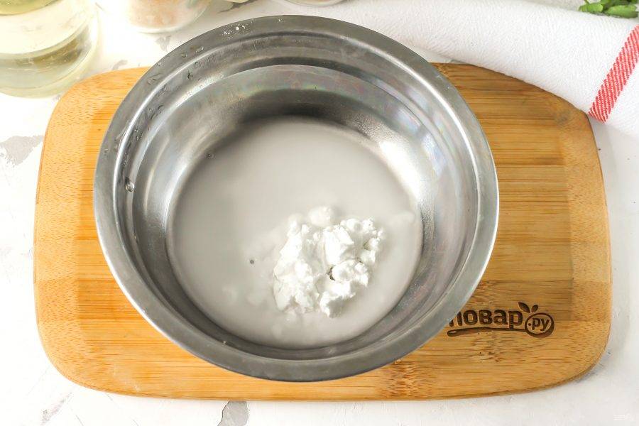 В отдельной емкости смешайте крахмал: картофельный или кукурузный с холодной водой. Именно с холодной, так как в горячей воде он образует комочки! Потом долейте растительное масло и размешайте.