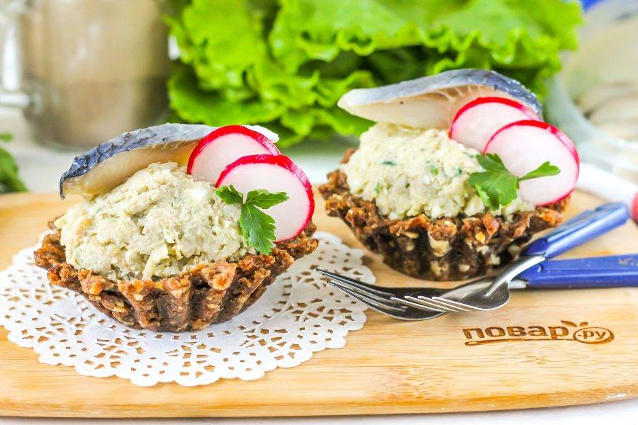 Наполните остывшие постные тарталетки начинкой, к примеру — рыбным паштетом. Украсьте и подайте к столу.