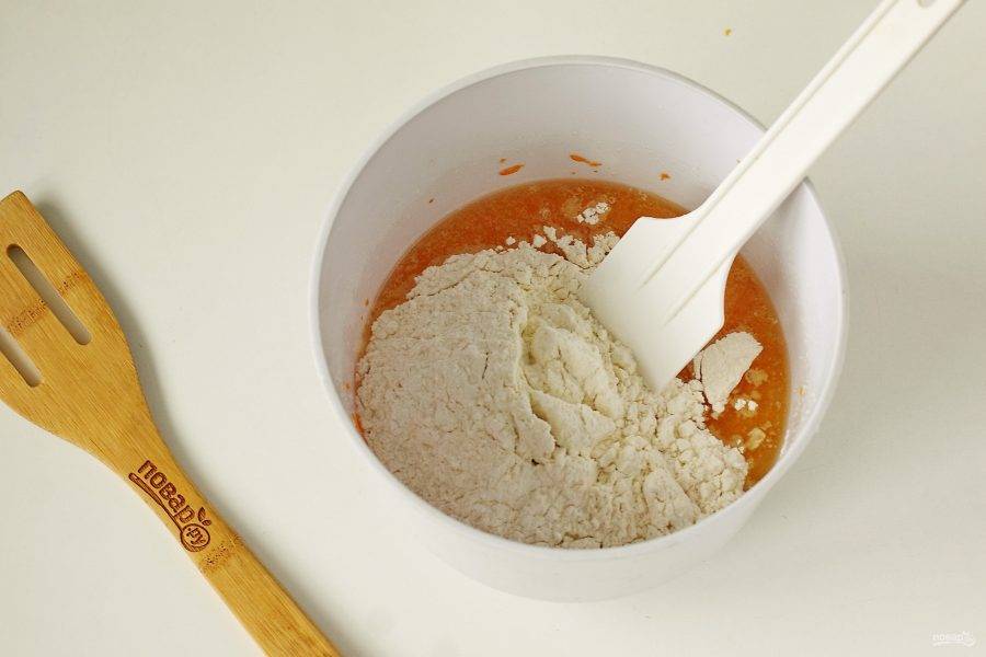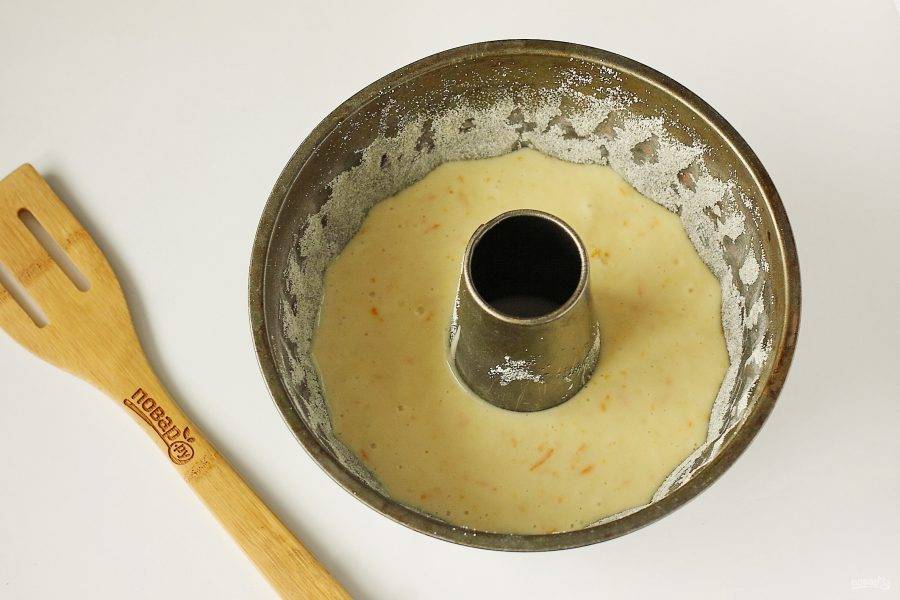 Перелейте тесто в смазанную маслом форму для запекания, дно и бока которой предварительно обсыпьте мукой или манкой. Выпекайте в духовке при температуре 180 градусов около 40 минут.