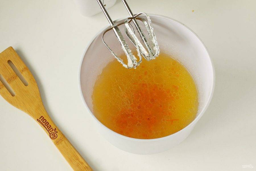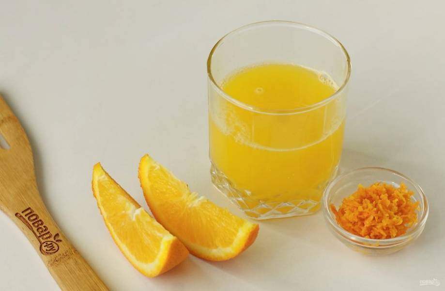С апельсина снимите цедру и выжмите сок. Для необходимого количества сока мне потребовалось два апельсина.