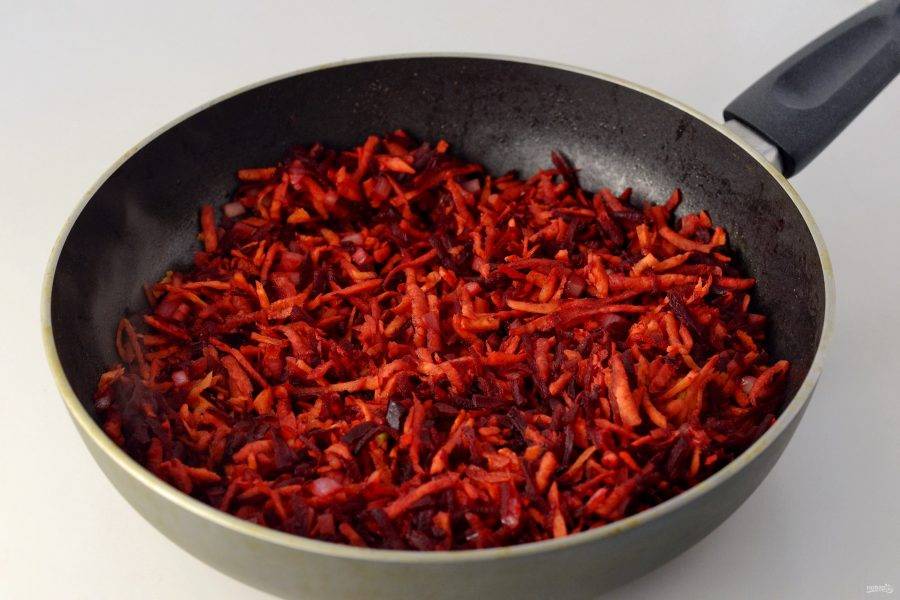 На сковороде потушите лук, морковь и свеклу 5-7 минут. Добавьте томатную пасту, перемешайте и тушите еще пару минут.