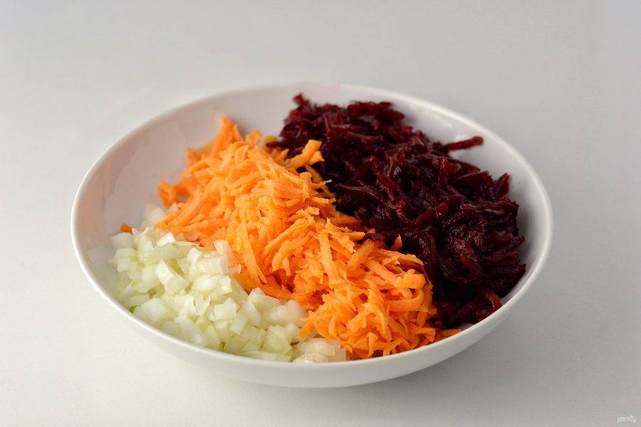 Натрите свеклу и морковь на крупной терке, репчатый лук нарежьте кубиками.