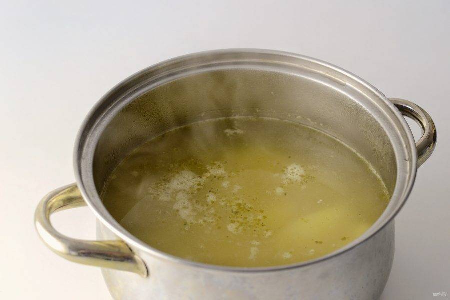 Картофель очистите, нарежьте на небольшие кубики. Доведите бульон до кипения, добавьте картофель и варите суп 5-7 минут.