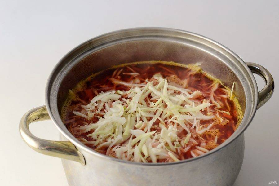 Добавьте в кастрюлю тушеные овощи и мелко нашинкованную капусту. Посолите и поперчите. Доведите до кипения и варите суп 10-15 минут.
