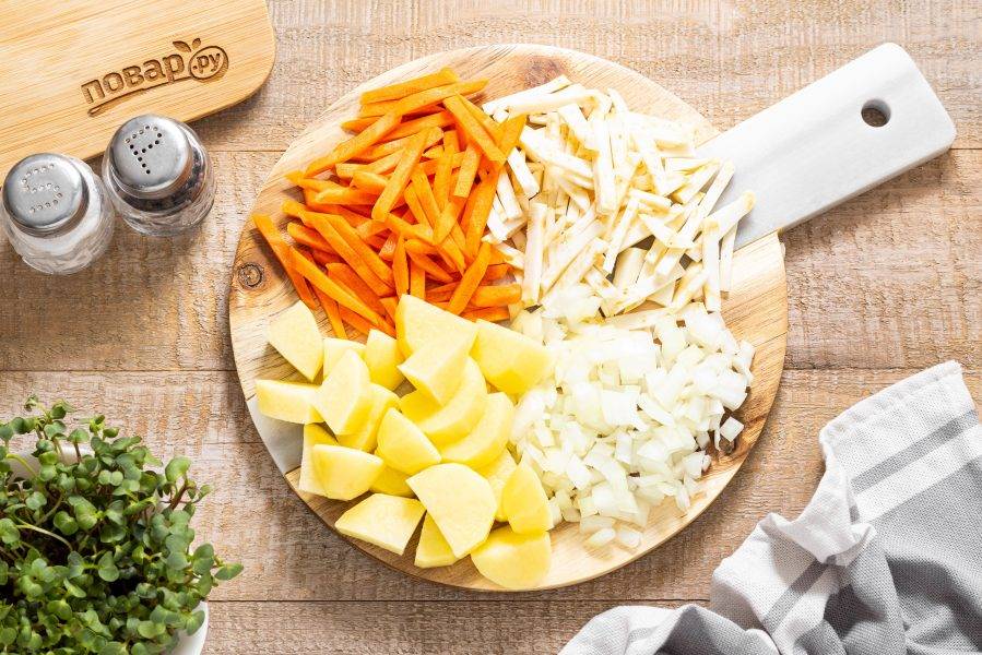Морковь и корень сельдерея очистите, нарежьте брусочками. Репчатый лук нарежьте на мелкие кубики. Картофель помойте, очистите, нарежьте на ломтики среднего размера.
