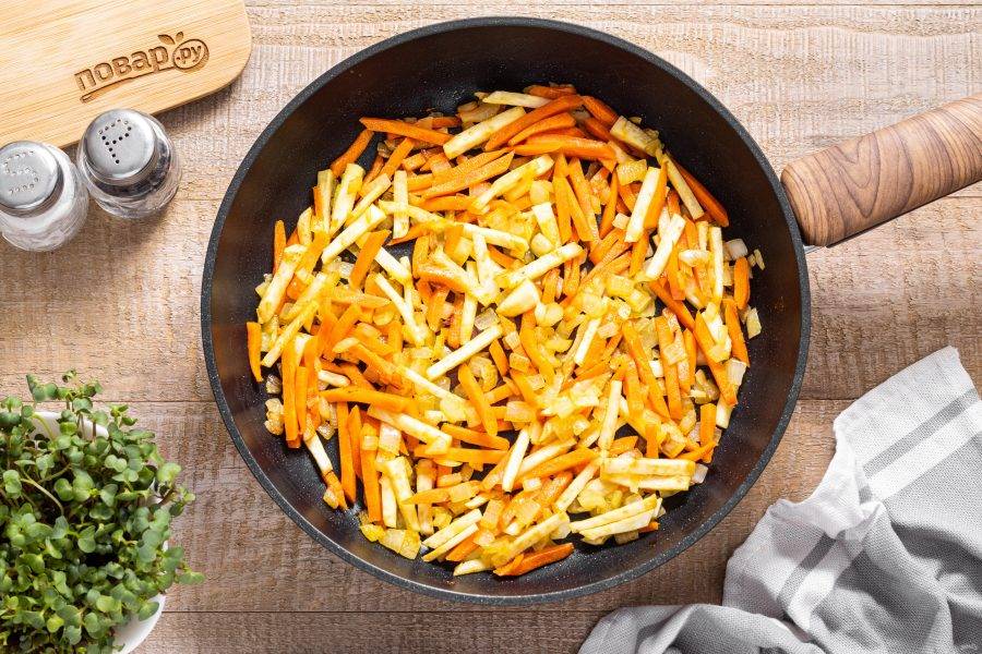 Добавьте морковь и корень сельдерея, жарьте овощи до мягкости и золотистого цвета.