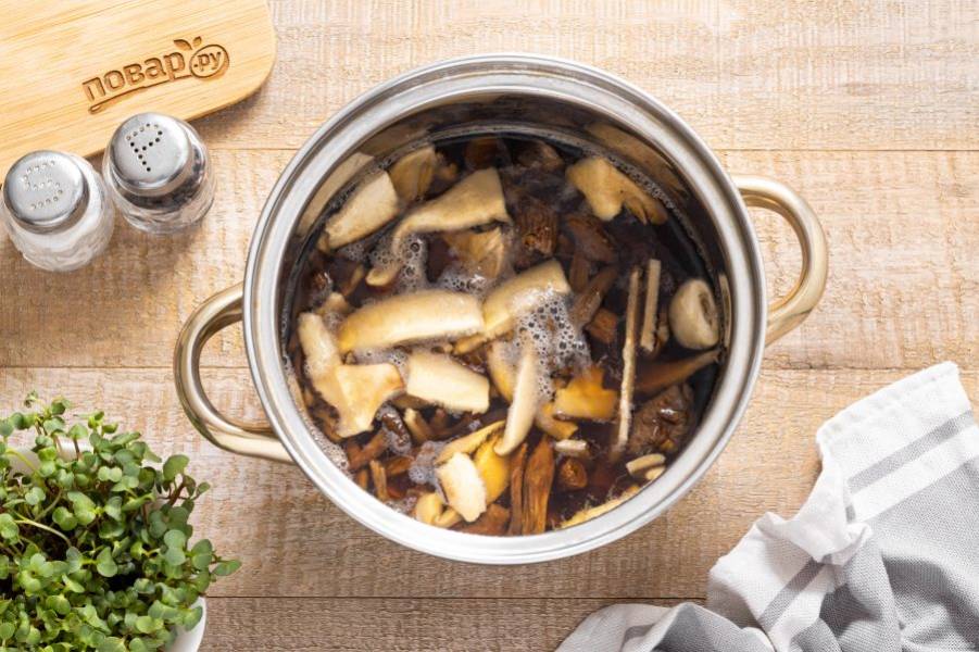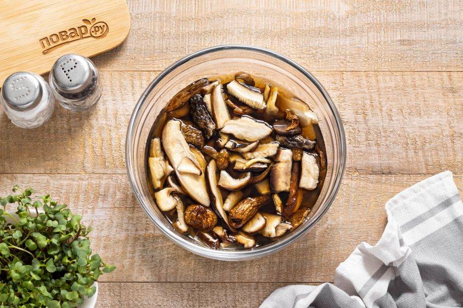 Сушеные грибы замочите в холодной воде на 2 часа.