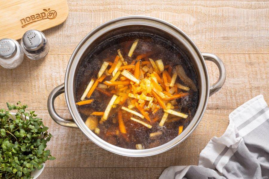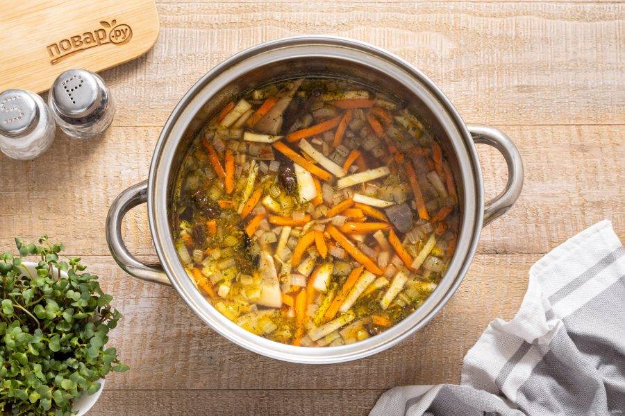 Добавьте обжаренные грибы и воду, в которой они замачивались в кастрюлю. Продолжайте варить суп.