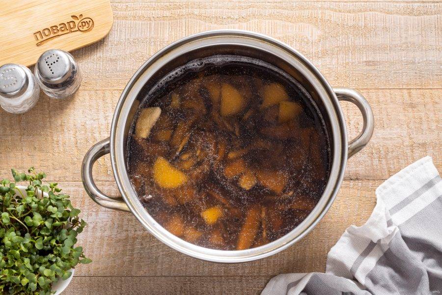 После процедите воду, в которой были грибы, через несколько слоев марли и сохраните. Сами грибы промойте и нарежьте на ломтики поменьше, если требуется. Отварите грибы 20 минут в кипящей воде.