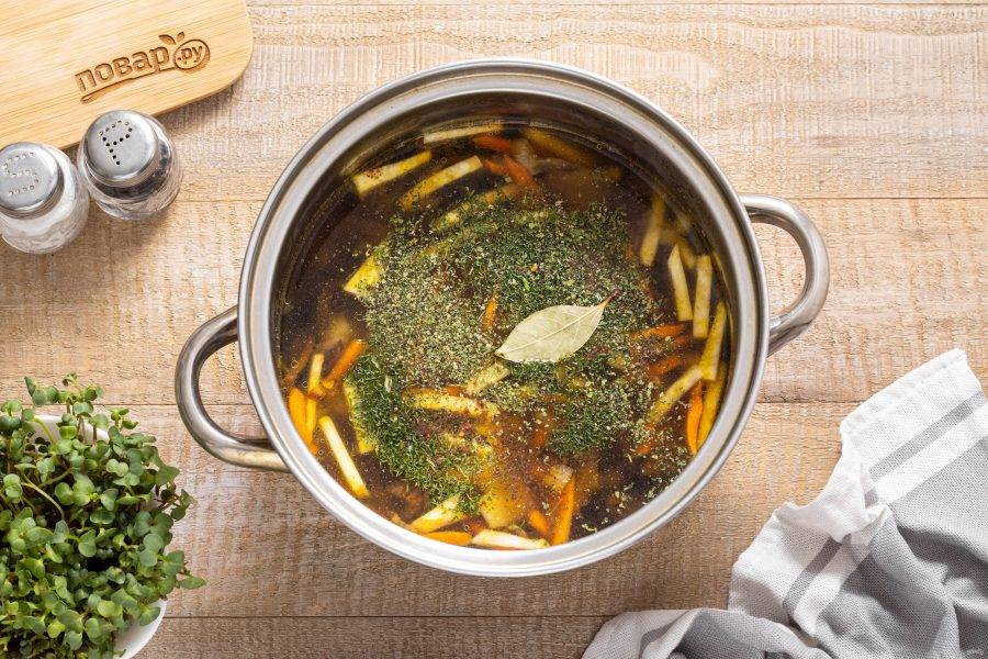 Добавьте черный молотый перец, лавровый лист и сушеную петрушку с укропом.