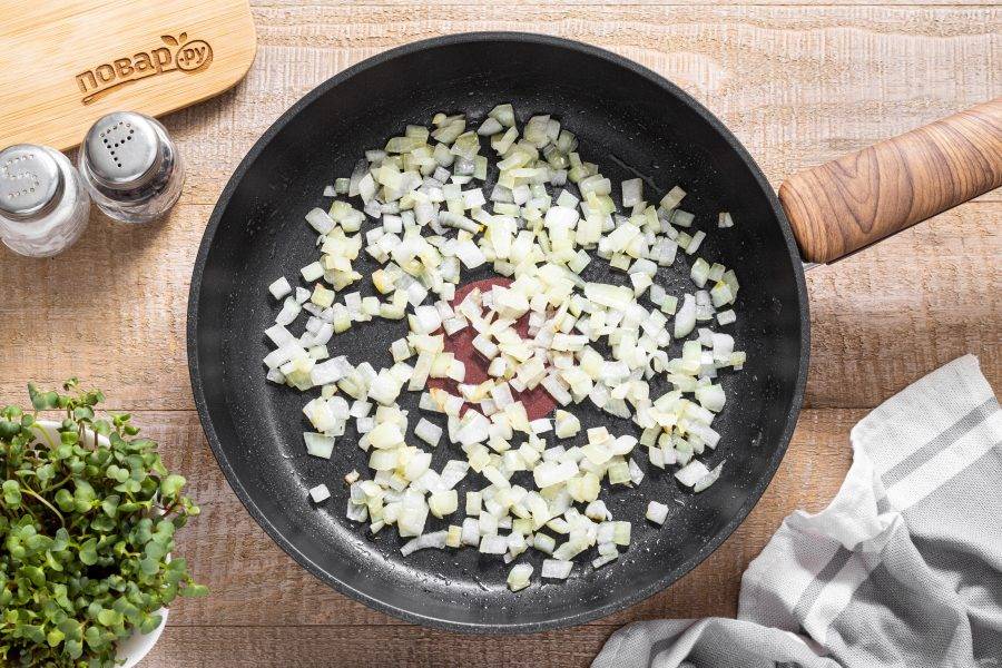 Параллельно обжарьте репчатый лук несколько минут до прозрачности.