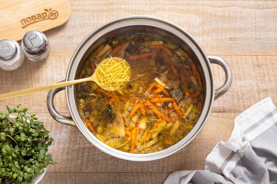 В конце добавьте вермишель. Варите суп 2 минуты, затем снимите с плиты и дайте настояться еще 10-15 минут.