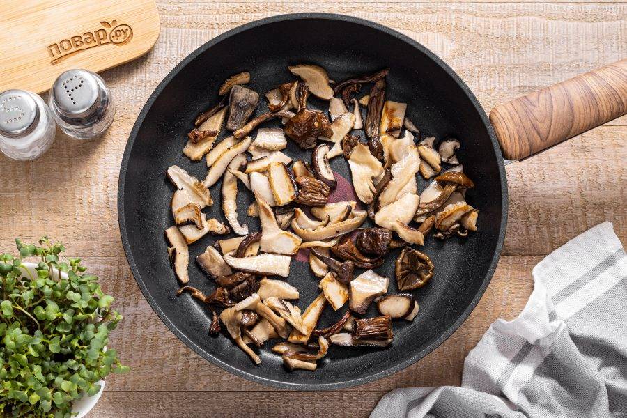 Разогрейте сковороду на среднем огне и обжарьте грибы около 5 минут до румяного цвета.