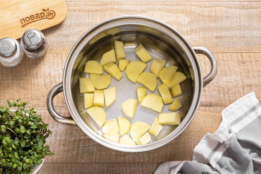 Переложите картофель в кастрюлю, влейте чистую воду. Доведите до кипения, подсолите и варите около 20 минут.
