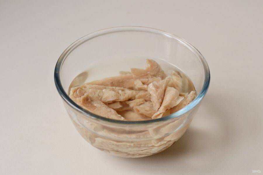 Разорвите соевое мясо на мелкие кусочки. Добавьте растительное масло, перемешайте.