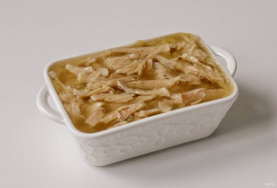 Перелейте бульон в форму. Поставьте холодец на 1 час в холодильник.