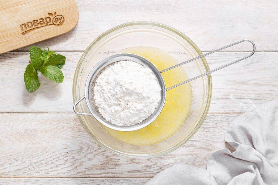 Смешайте муку с разрыхлителем и ванилином. Просейте в миску с жидкими ингредиентами.