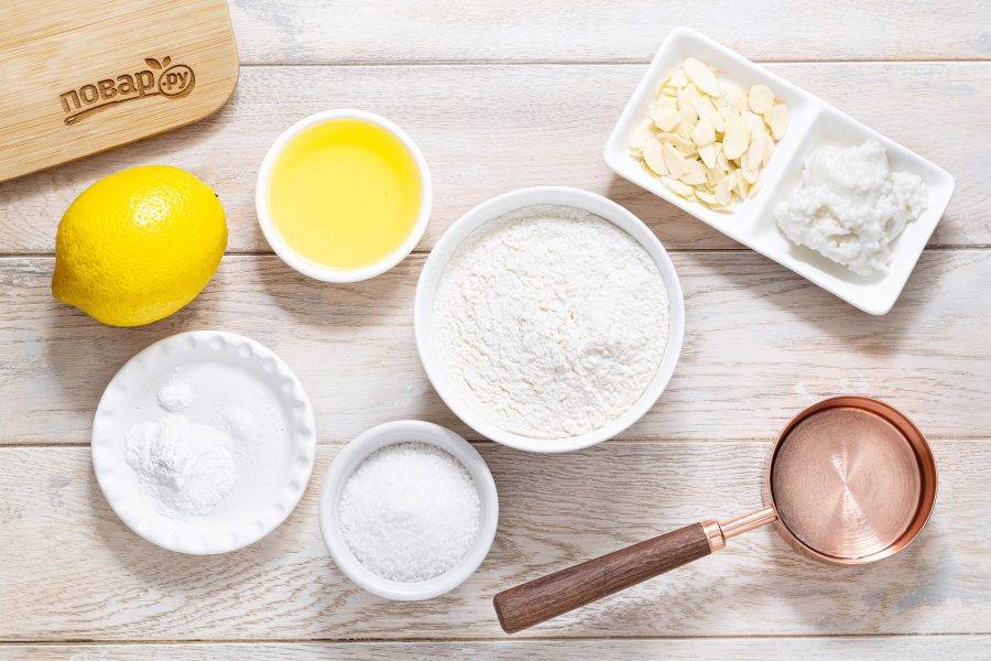 Смажьте верхушку кекса урбечем из кокоса, а сверху украсьте лимонной цедрой и миндальными лепестками.