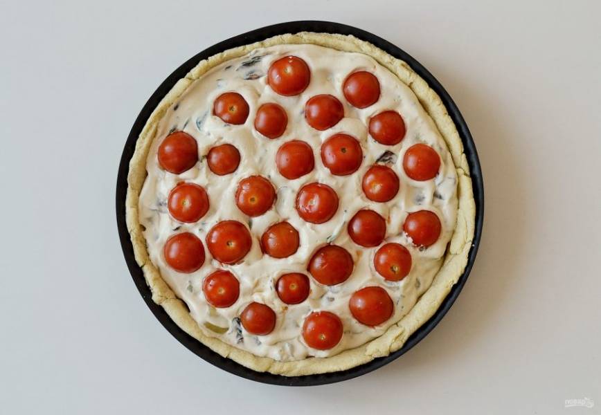 Помидоры черри разрежьте пополам, выложите сверху на пирог. Выпекайте киш в духовке 30-40 минут при температуре 180 градусов.
