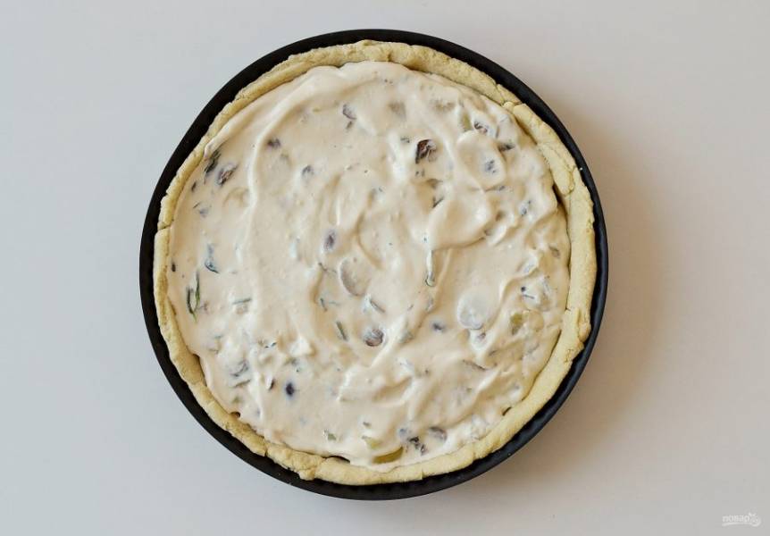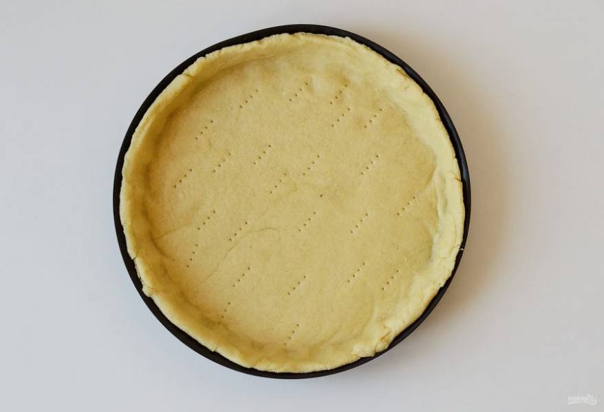Раскатайте тесто по диаметру формы для выпечки, сформируйте бортики. Наколите вилкой дно. Выпекайте в духовке 10 минут при температуре 180 градусов.