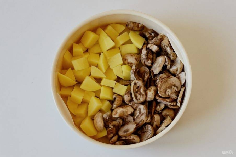 Картошку и грибы нарежьте крупными ломтиками, затем приготовьте на пару 5-10 минут. За пару минут до готовности добавьте крупно порубленный шпинат.