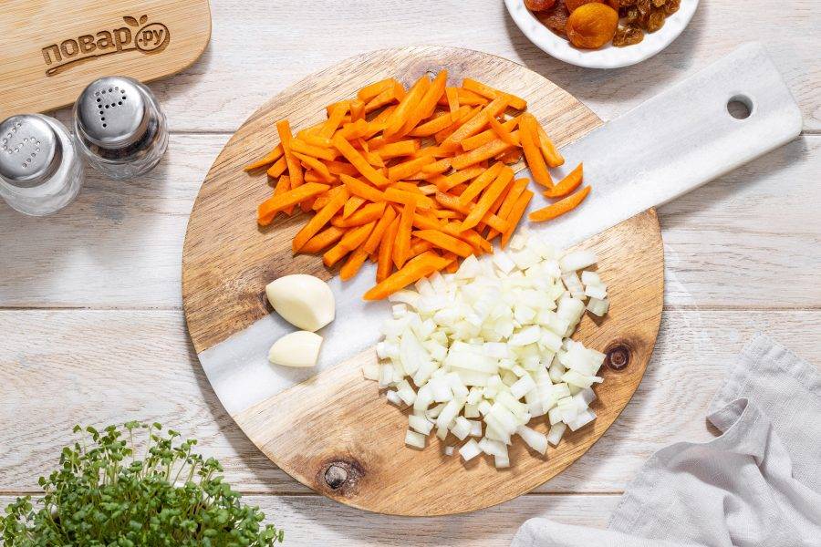 Морковь очистите, нарежьте брусочками. Репчатый лук нарежьте на кубики.