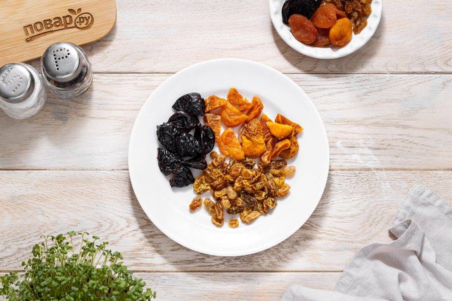 Сухофрукты замочите в теплой воде на 5 минут, затем промойте и обсушите.