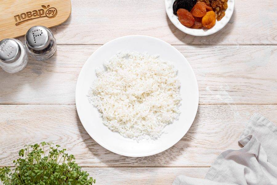 Аккуратно влейте горячую воду так, чтобы рис не перемешивался с сухофруктами и овощами. Пропорция риса и воды 1:2, вода должна быть выше риса примерно на 1 см. Варите на небольшом огне 20 минут.