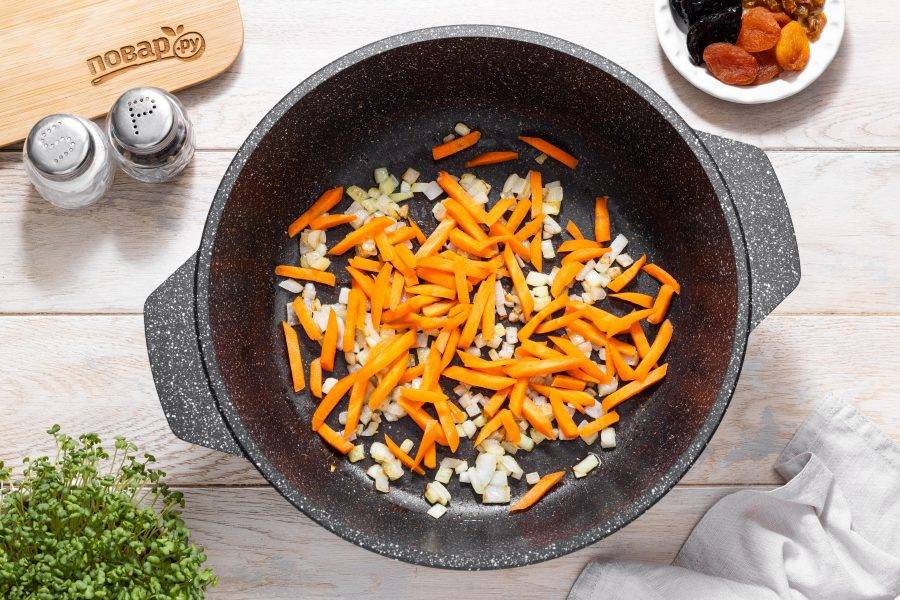 Добавьте морковь и жарьте до золотистого цвета моркови.