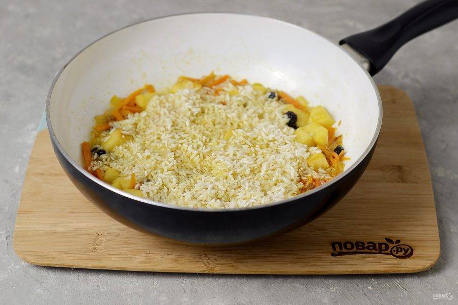 Рис промойте, выложите ровным слоем в сковороду. Сверху подлейте горячей воды так, чтобы она покрывала рис. Накройте крышкой и томите на слабом огне 20-25 минут.