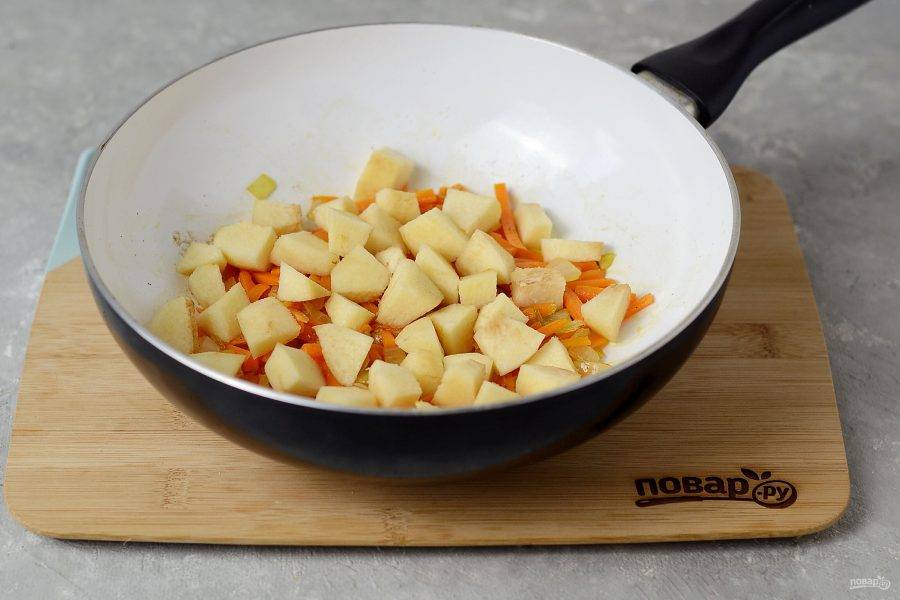 Айву очистите от кожуры, нарежьте на кубики среднего размера. Добавьте в сковороду еще немного растительного масла. Перемешайте и тушите, пока айва не станет немного мягкой.