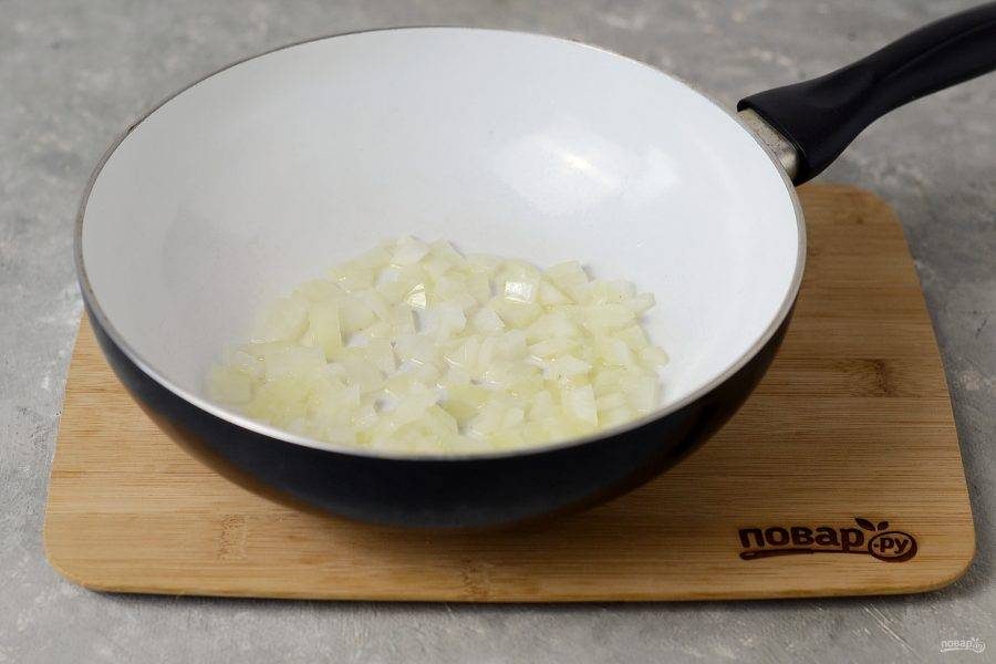 Нарежьте репчатый лук на кубики среднего размера. В сковороде разогрейте масло, обжарьте лук до легкого золотистого цвета.