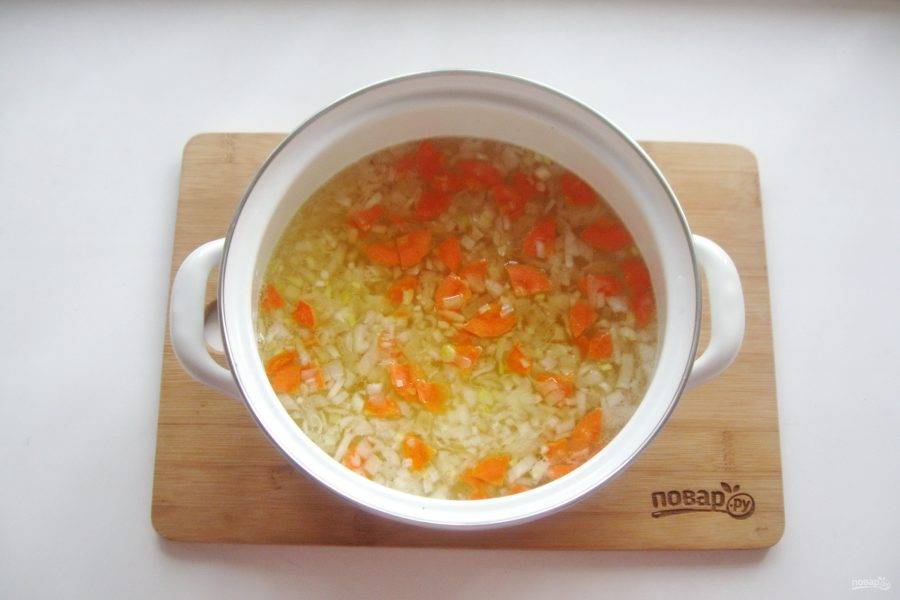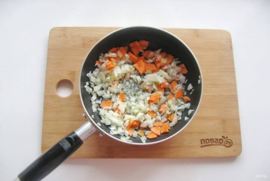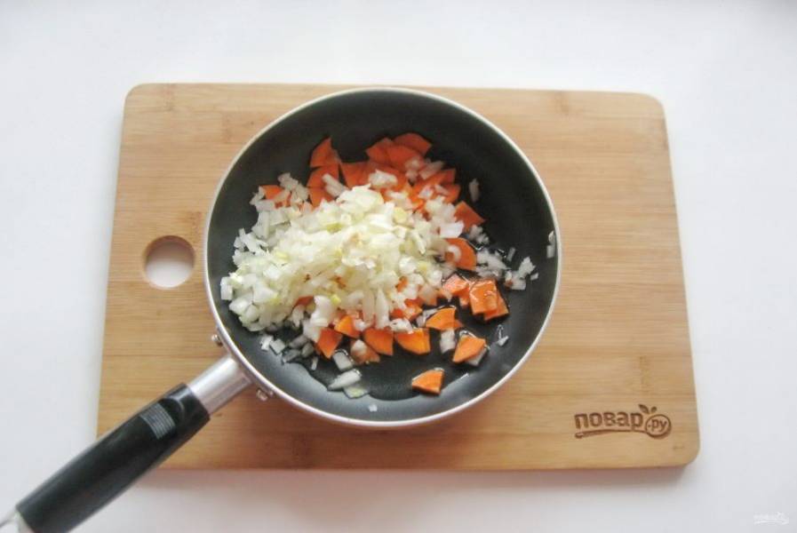 Морковь и лук мелко нарежьте, выложите в сковороду с рафинированным подсолнечным маслом.