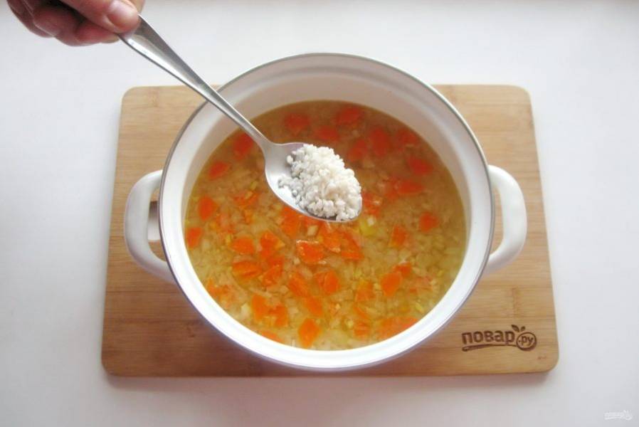 Когда овощи в супе будут на стадии полуготовности, добавьте в кастрюлю рис.