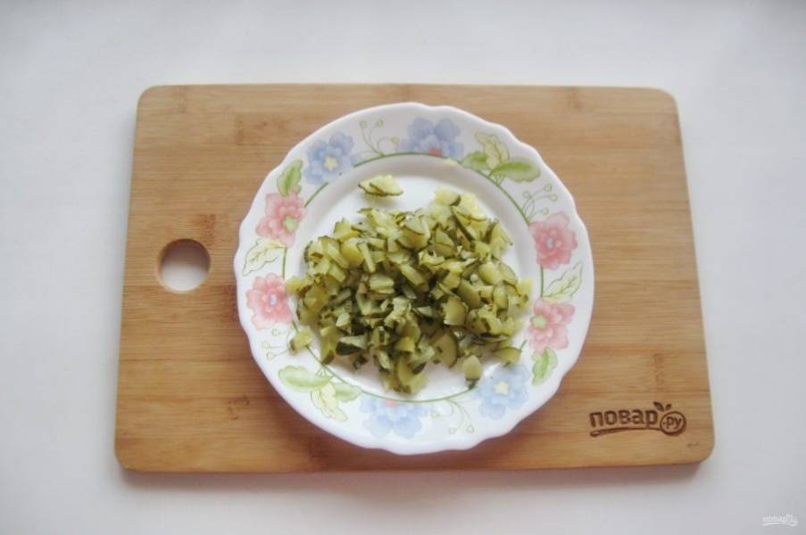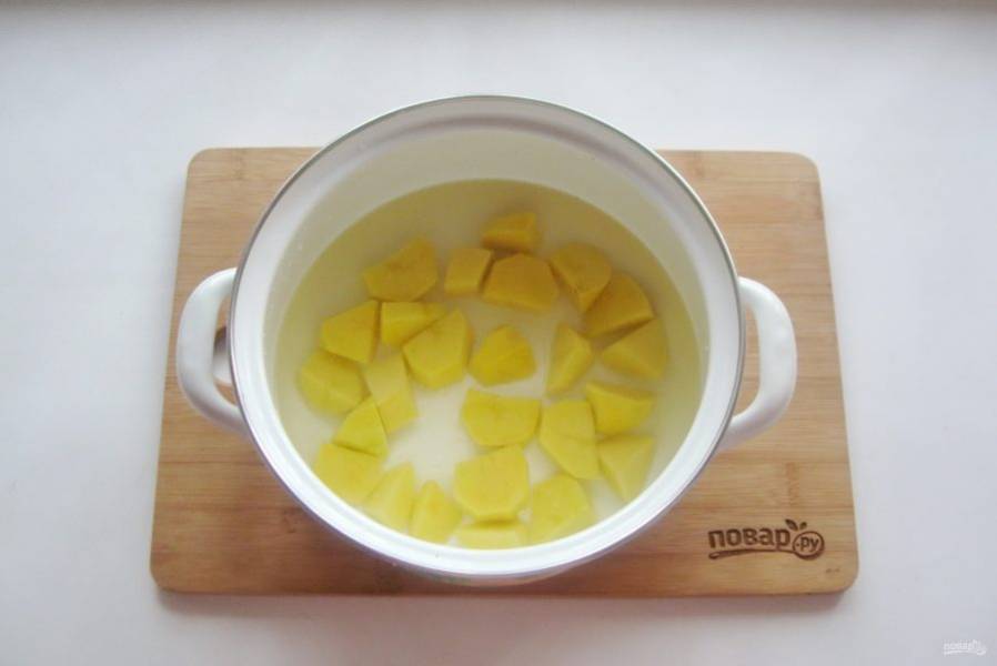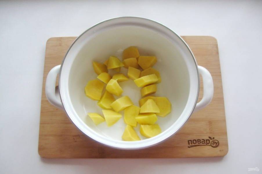 Картофель нарежьте кубиками и выложите в кастрюлю.