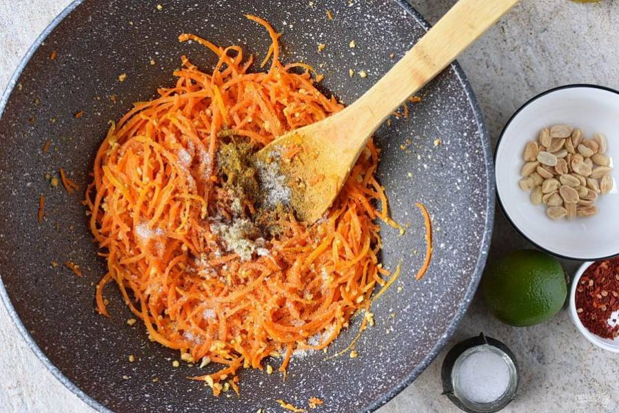 Добавьте к моркови чеснок, соль и черный перец по вкусу, всыпьте сахар и порошок карри. Хорошо перемешайте.