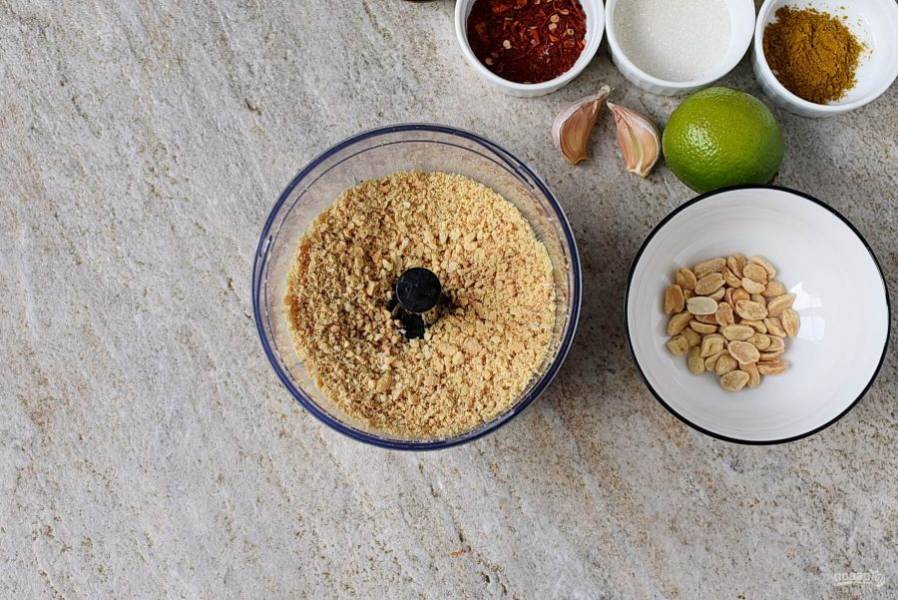 Арахис крупно измельчите в блендере, отложив немного для украшения салата.
