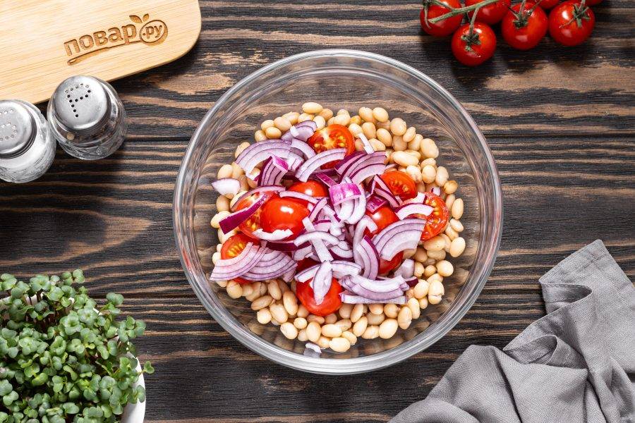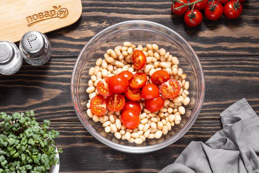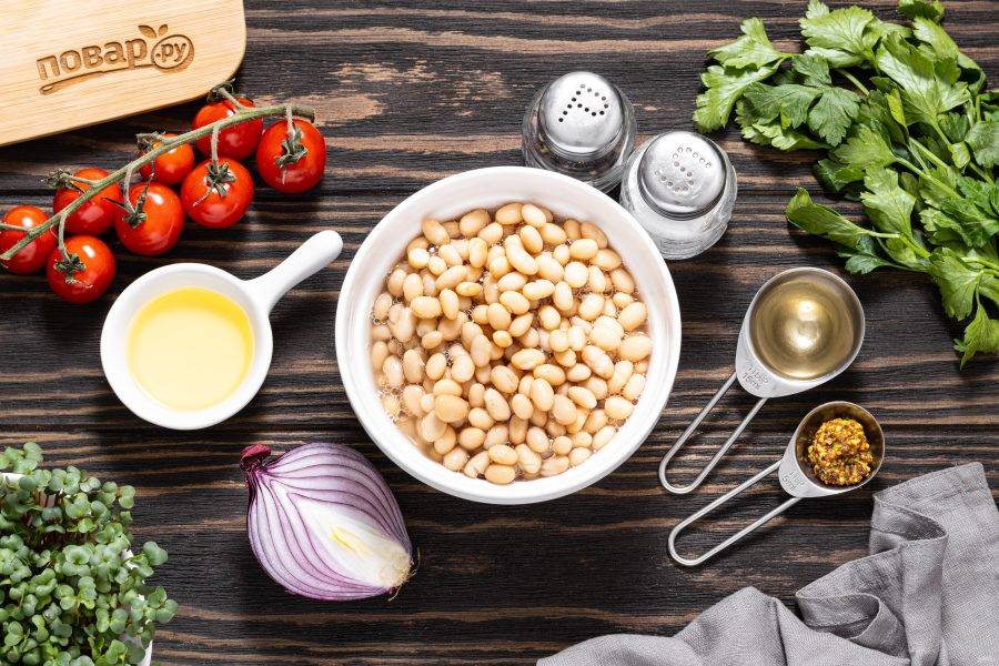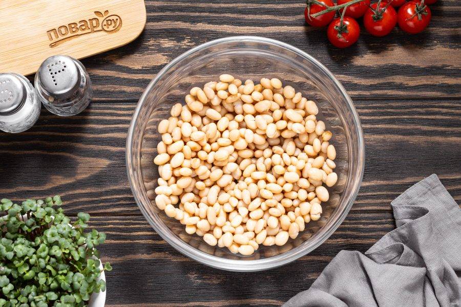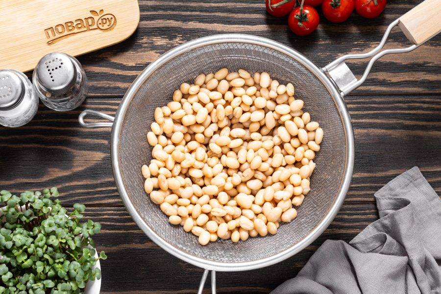 Слейте жидкость от консервированной фасоли. Фасоль промойте, откиньте на сито и дайте стечь лишней жидкости.